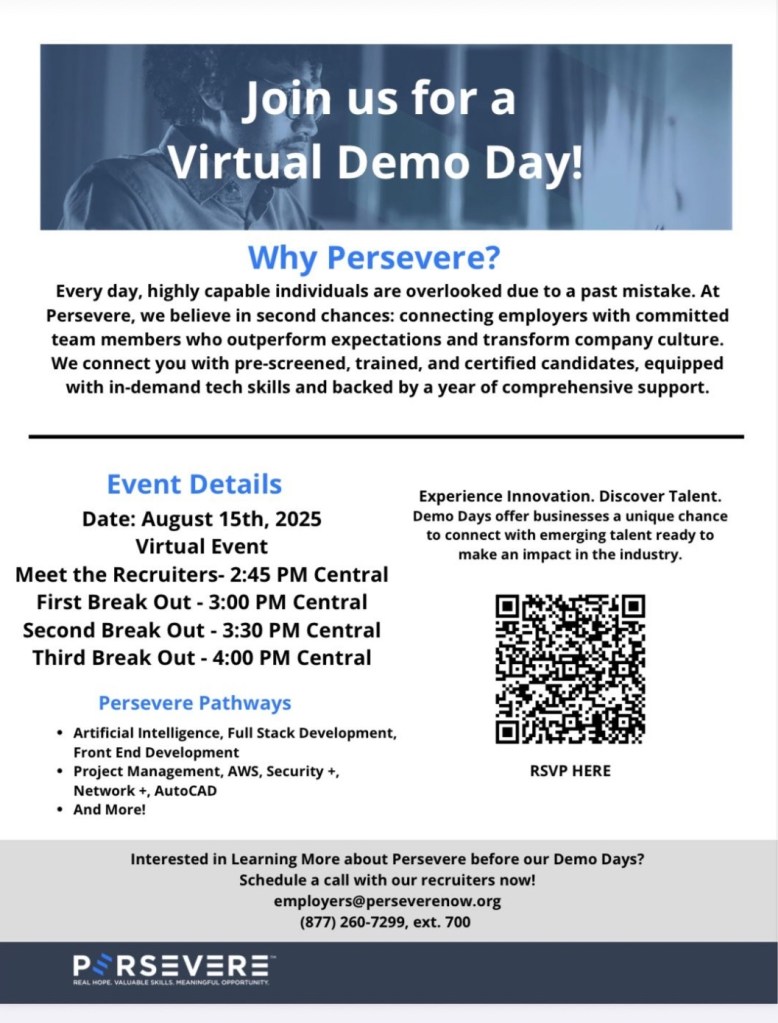 If you’ve ever said your company believes in diversity, inclusion, or second chances, now is the time to act. Open the door. Sit down with a Persevere graduate. Ask about their journey. You’ll walk away not just with a new hire, but with a renewed belief in what’s possible when we invest in people over pasts.